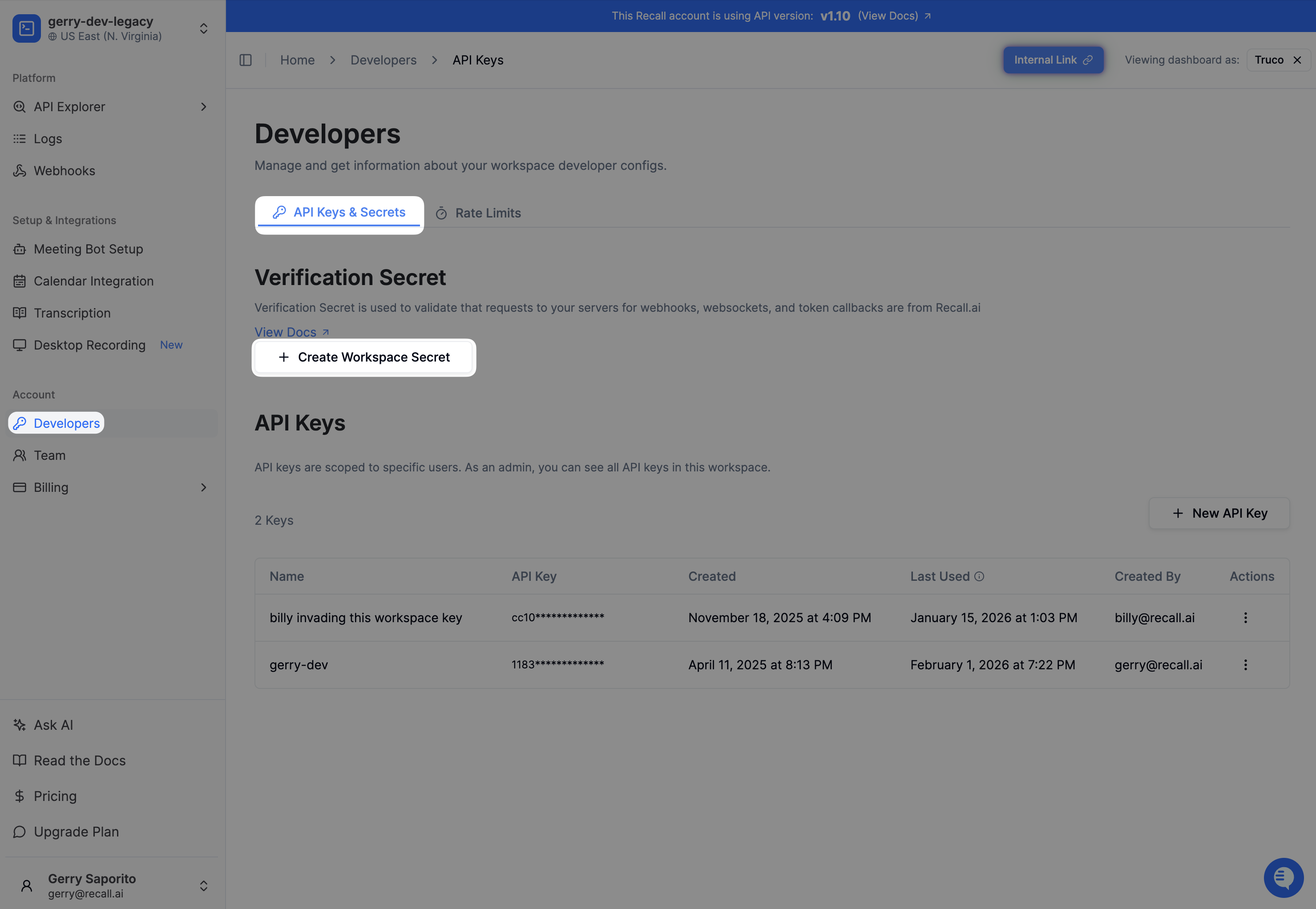 You can generate a single verification secret from the dashboard in the API keys page to verify all requests (webhooks, websockets, callbacks) from Recall.