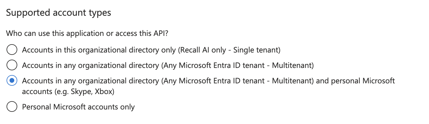 Under Supported account types, select: Accounts in any organizational directory (Any Microsoft Entra ID tenant - Multitenant) and personal Microsoft accounts (e.g. Skype, Xbox)