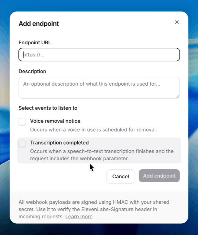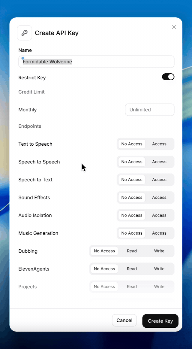 - Create a new API key, and make sure it has access to Eleven Labs Speech-to-Text: