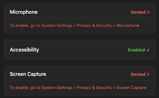 You can request permissions using the RecallAiSdk.requestPermission SDK method. To record meetings, you'll need at least the accessibility, microphone, and either the screen-capture or system-audio permission. You can request system-audio if you don't need video of the meeting. Otherwise, request screen-capture.