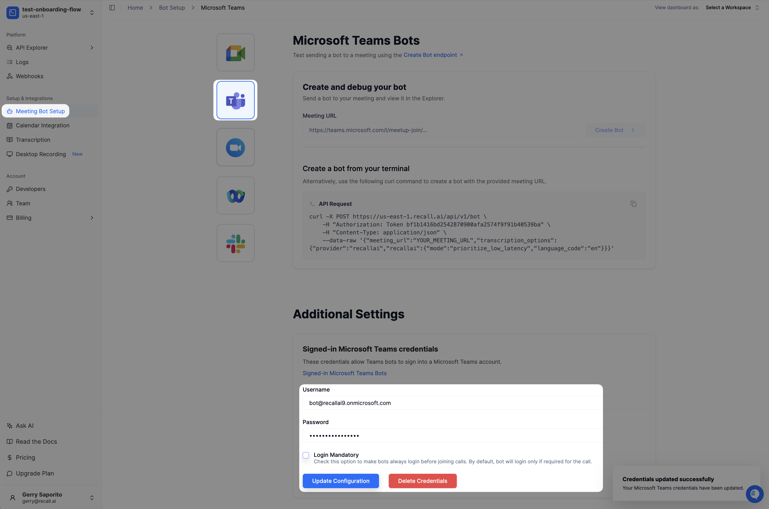 Head to the dashboard's Meeting Bot Setup > Microsoft Teams page and add the bot's email & password