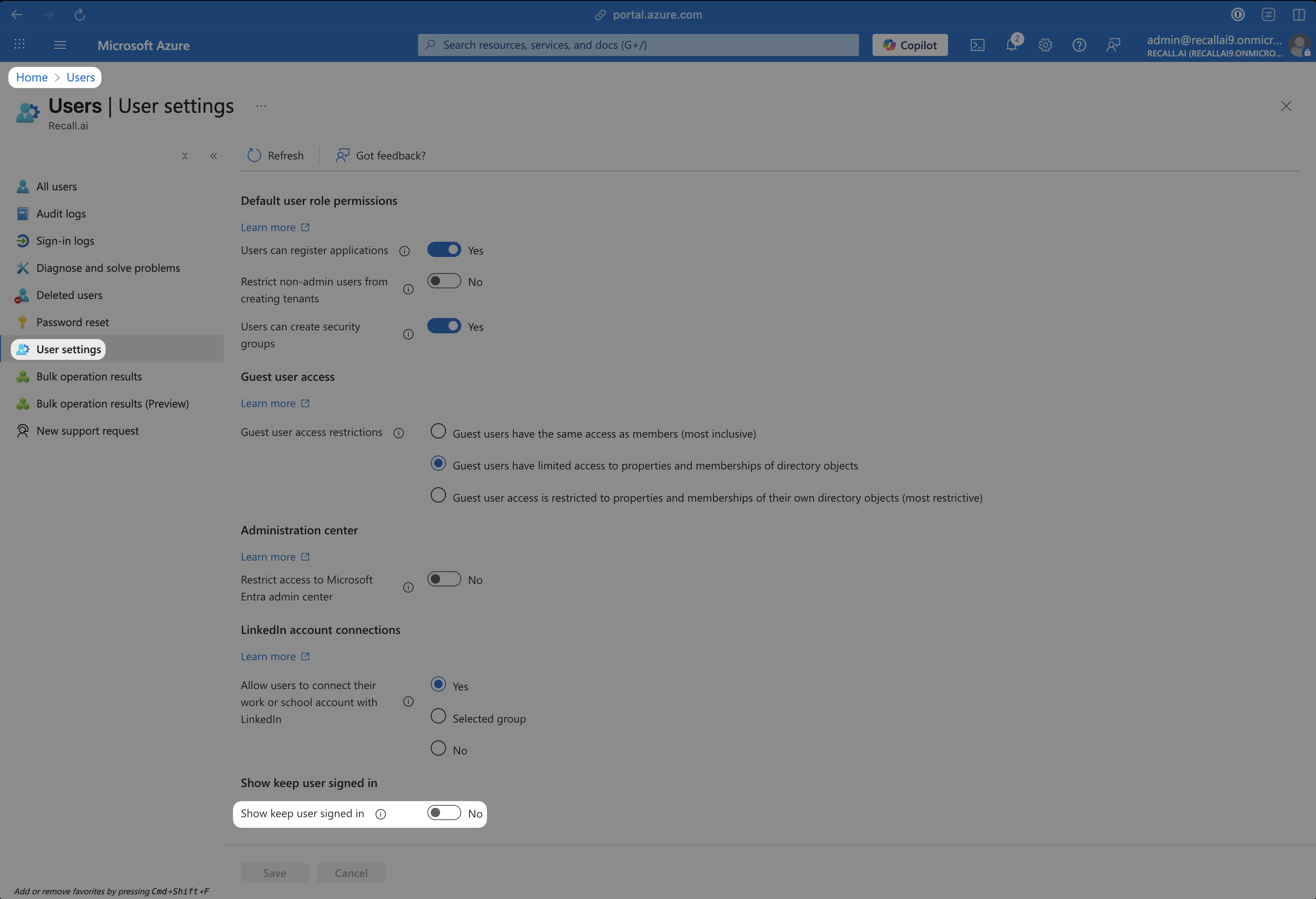 in the sidebar and disable the "Show keep users signed in" toggle. The path and toggle can be seen in the image below