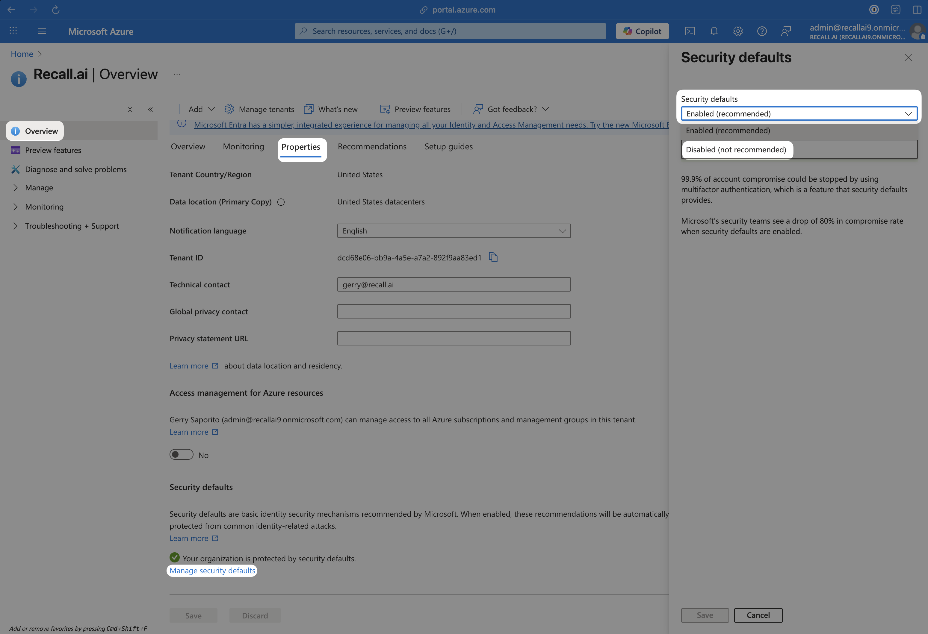 product, disable the security defaults found in Overview > Properties > Manage Security Defaults