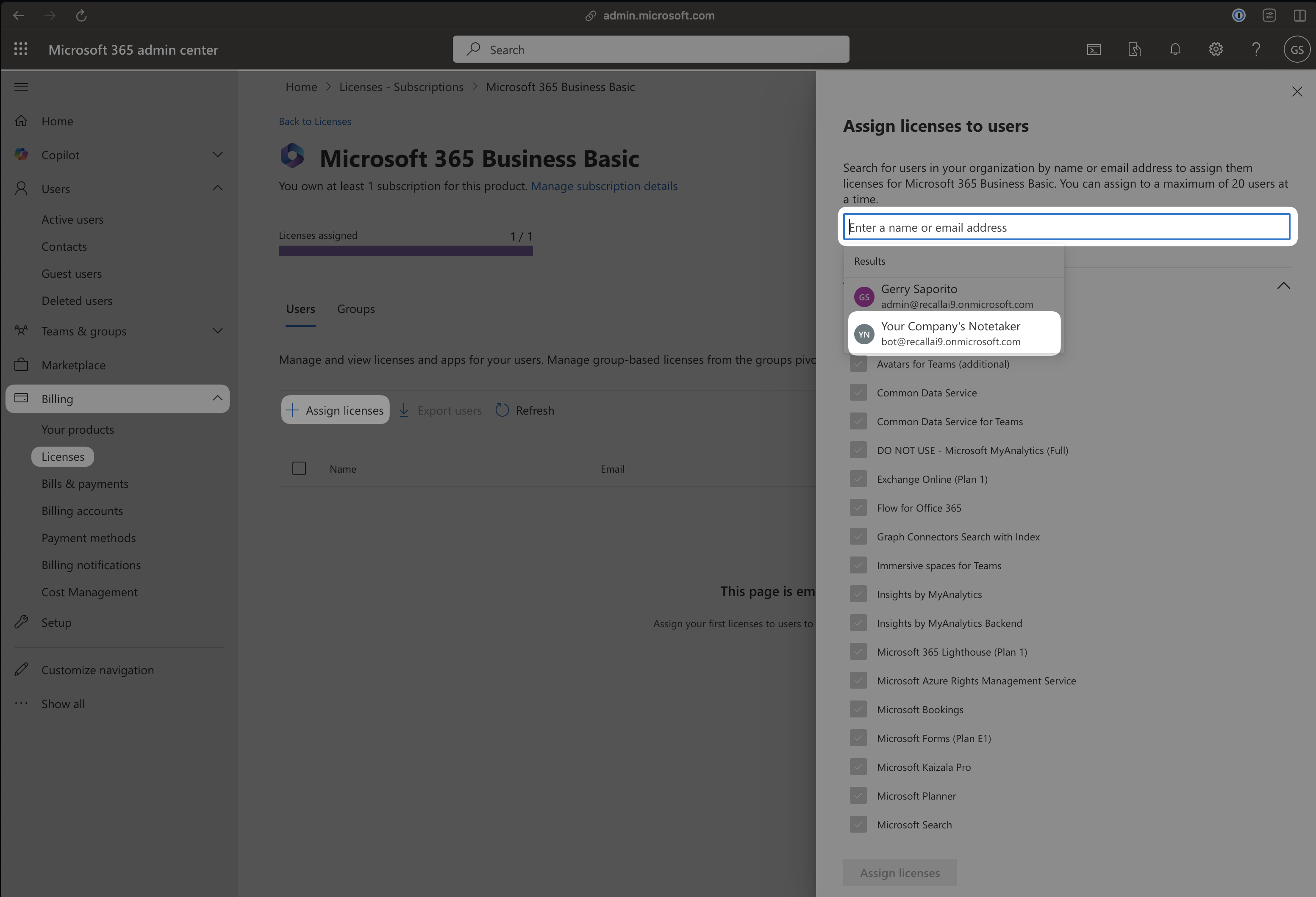 First head to Billing > Licenses > Microsoft 365 Business Basic and select your admin account. Then you will see the option to unassign licenses