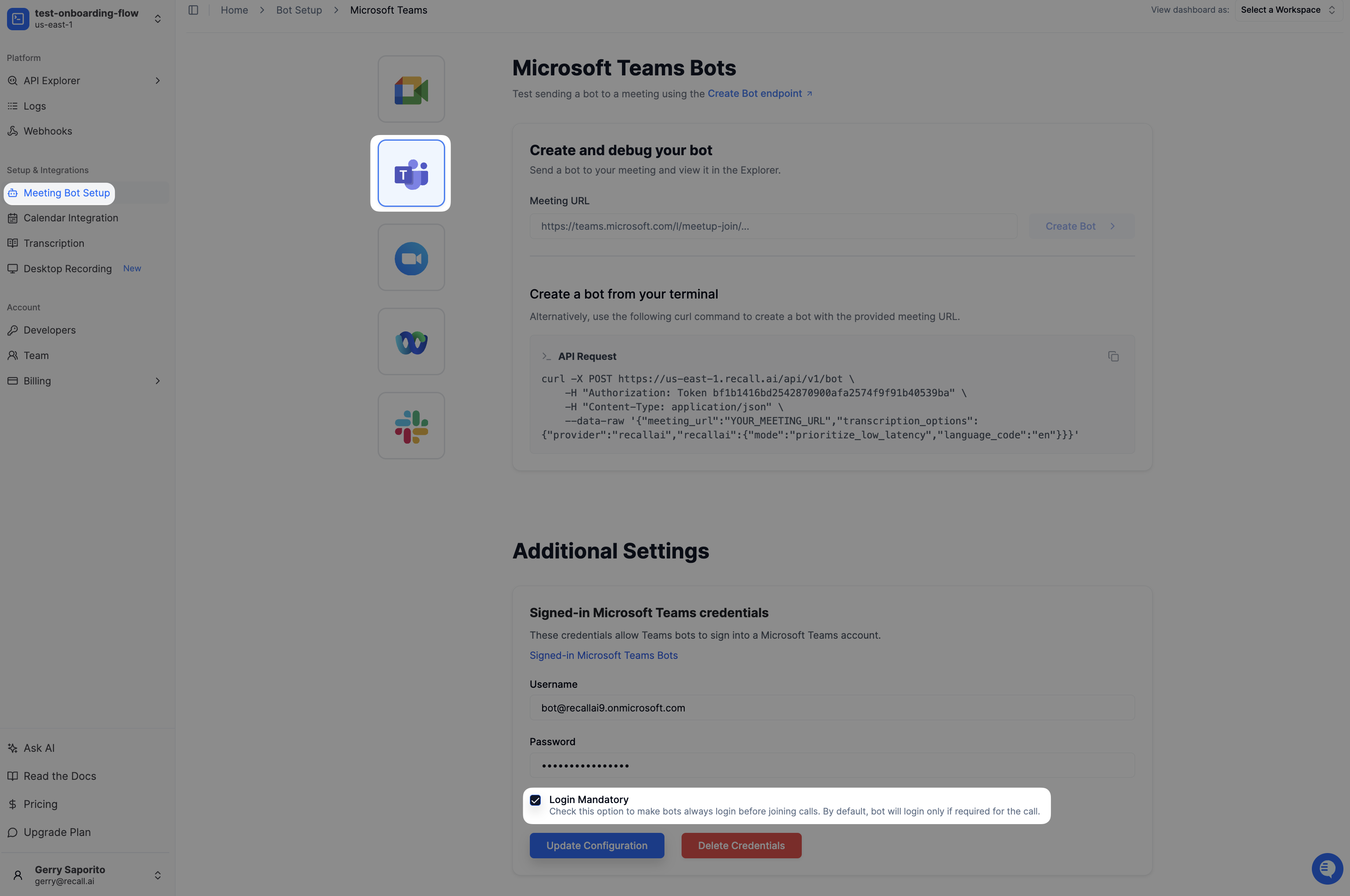 When testing, select the "Login Mandatory" option in the Recall dashboard's Meeting Bot Setup > Teams > Signed-in Microsoft Teams credentials. Then you can send a bot to a Teams meeting to see it sign-in. Don't forget to disable this again after your test