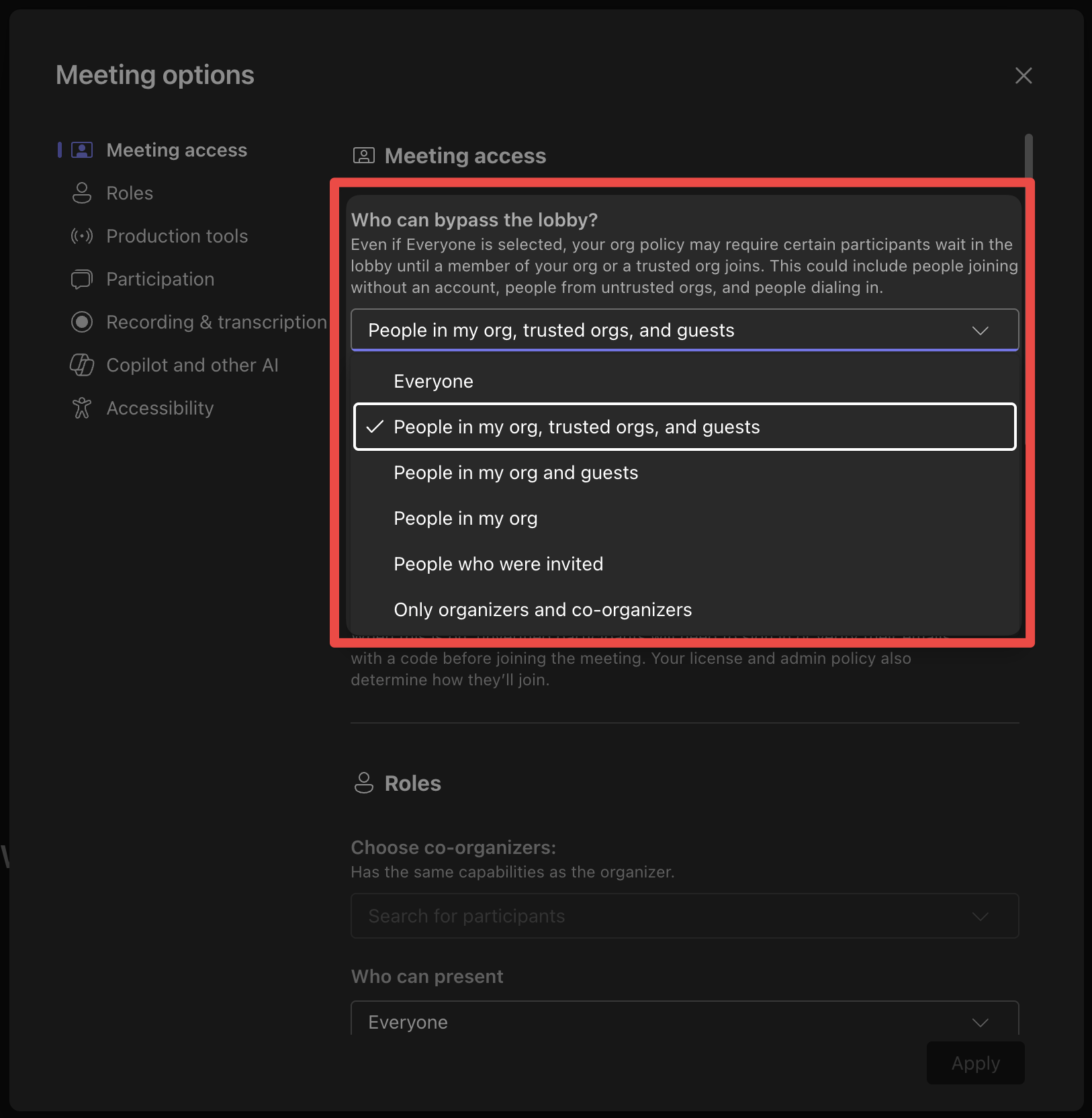 - the bot can skip the waiting room without conditionsEveryone in my org, trusted orgs, and guests