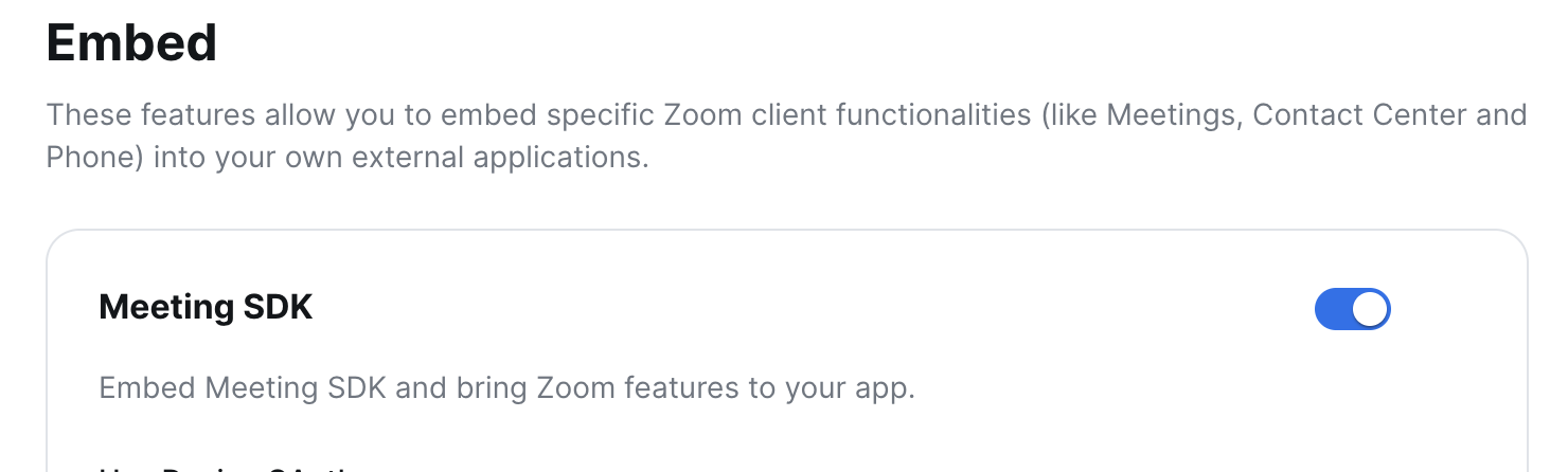 Also, head down to the "Embed" section and be sure to enable the "Meeting SDK" feature