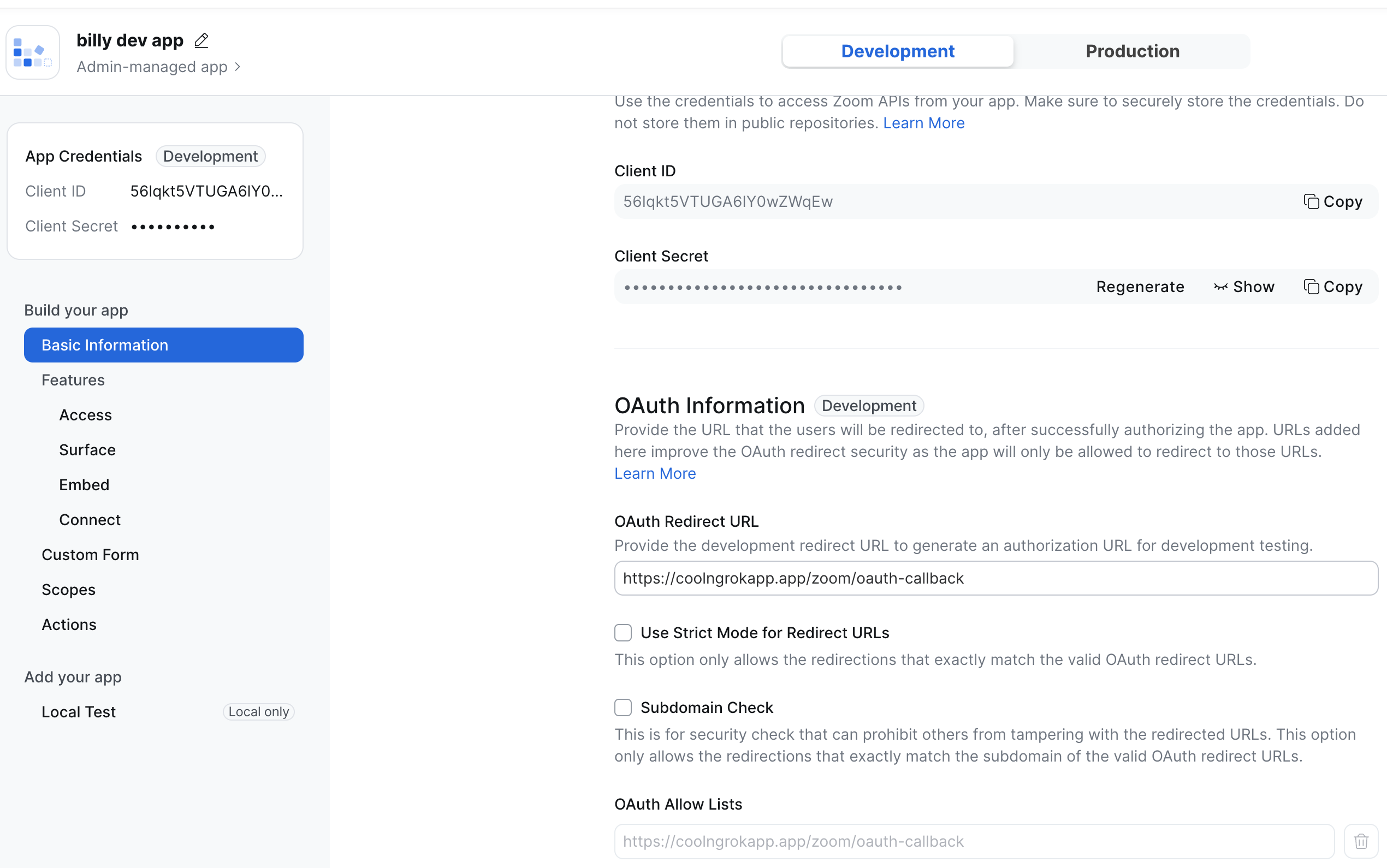 Before we do that though, we'll need to modify our app's configuration in Zoom one more time. Specifically, set the OAuth information to match both the redirect URL, as well as adding the callback URL you configured to the allow list.