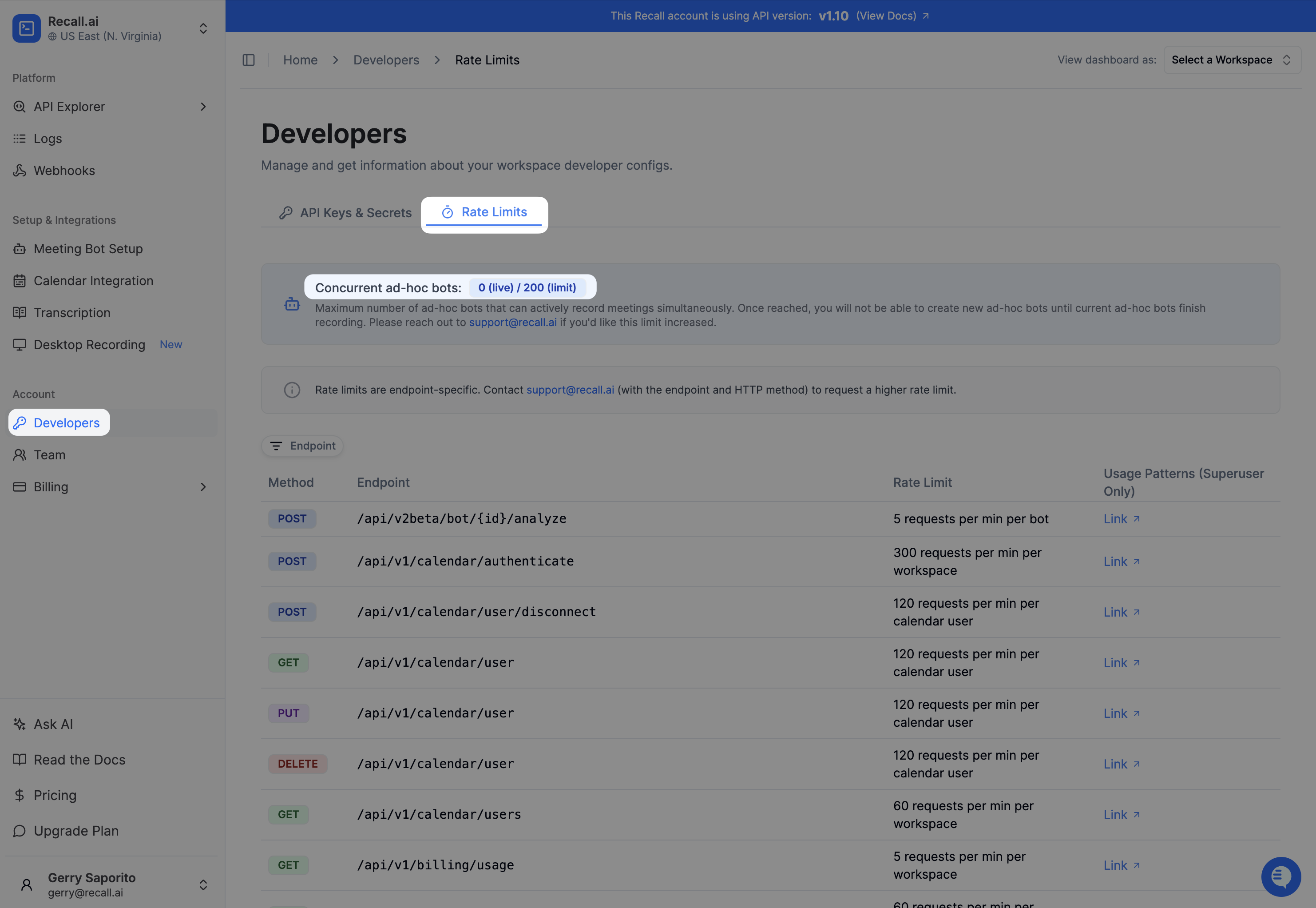 You can find a given workspace's concurrent ad-hoc bot limit in the dashboard under Developers > Rate Limits