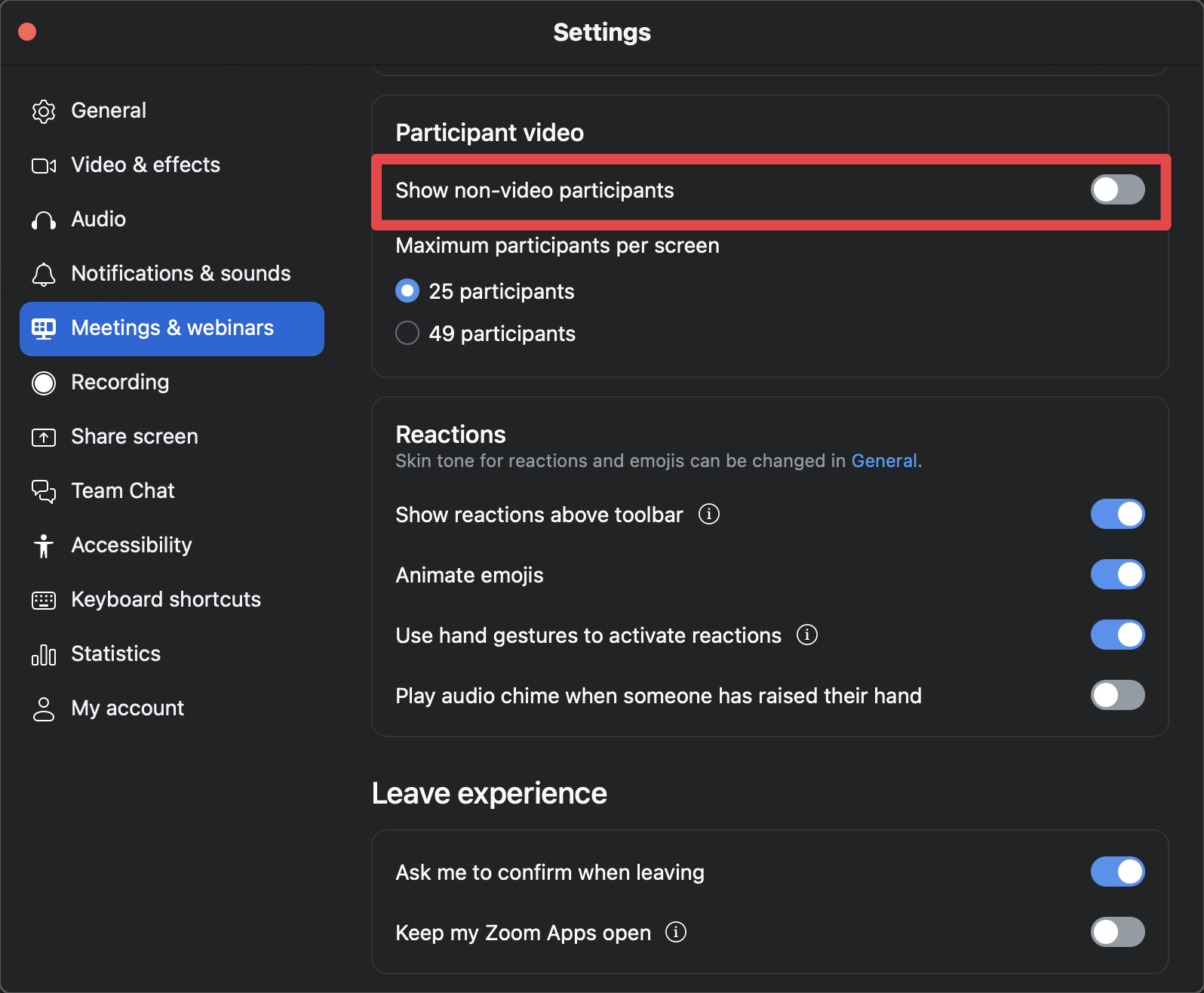 If an end user would like to remove the bot from their view on Zoom calls, they can disable the Show non-video participants setting under Meeting & webinars > Participant video:
